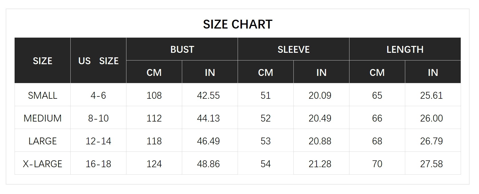 Size (Medium): Bust 44.09", Length 25.98", Sleeve 20.47"