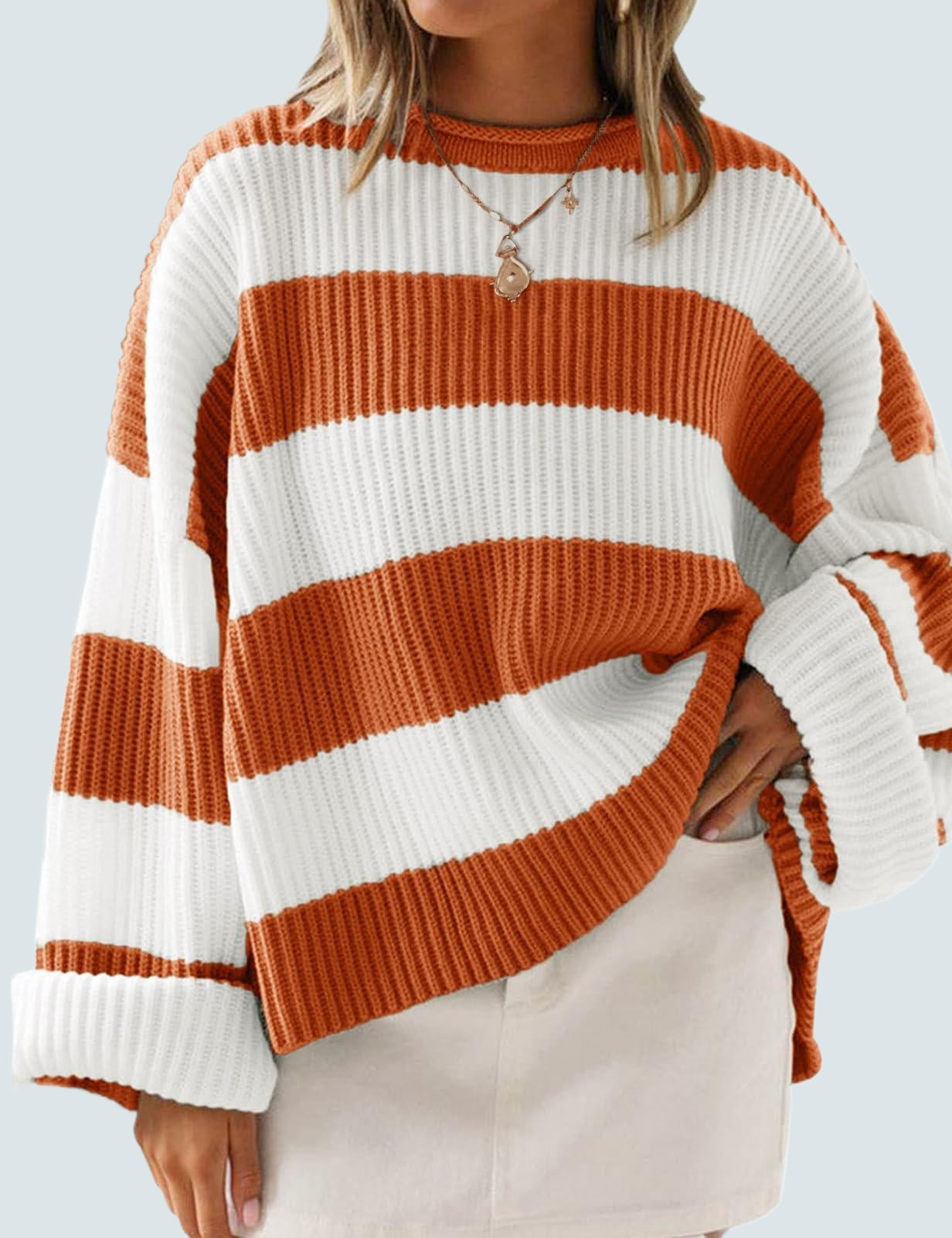 Design: Loose-fitting pullover with bold color block stripes; flared long sleeves; soft and cozy knit for comfort and style