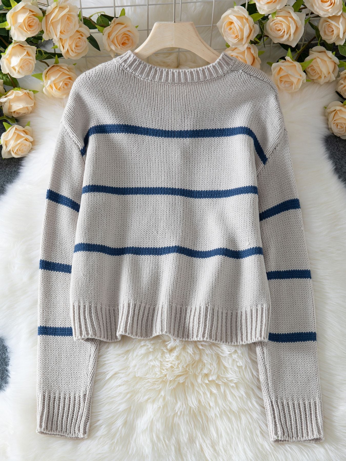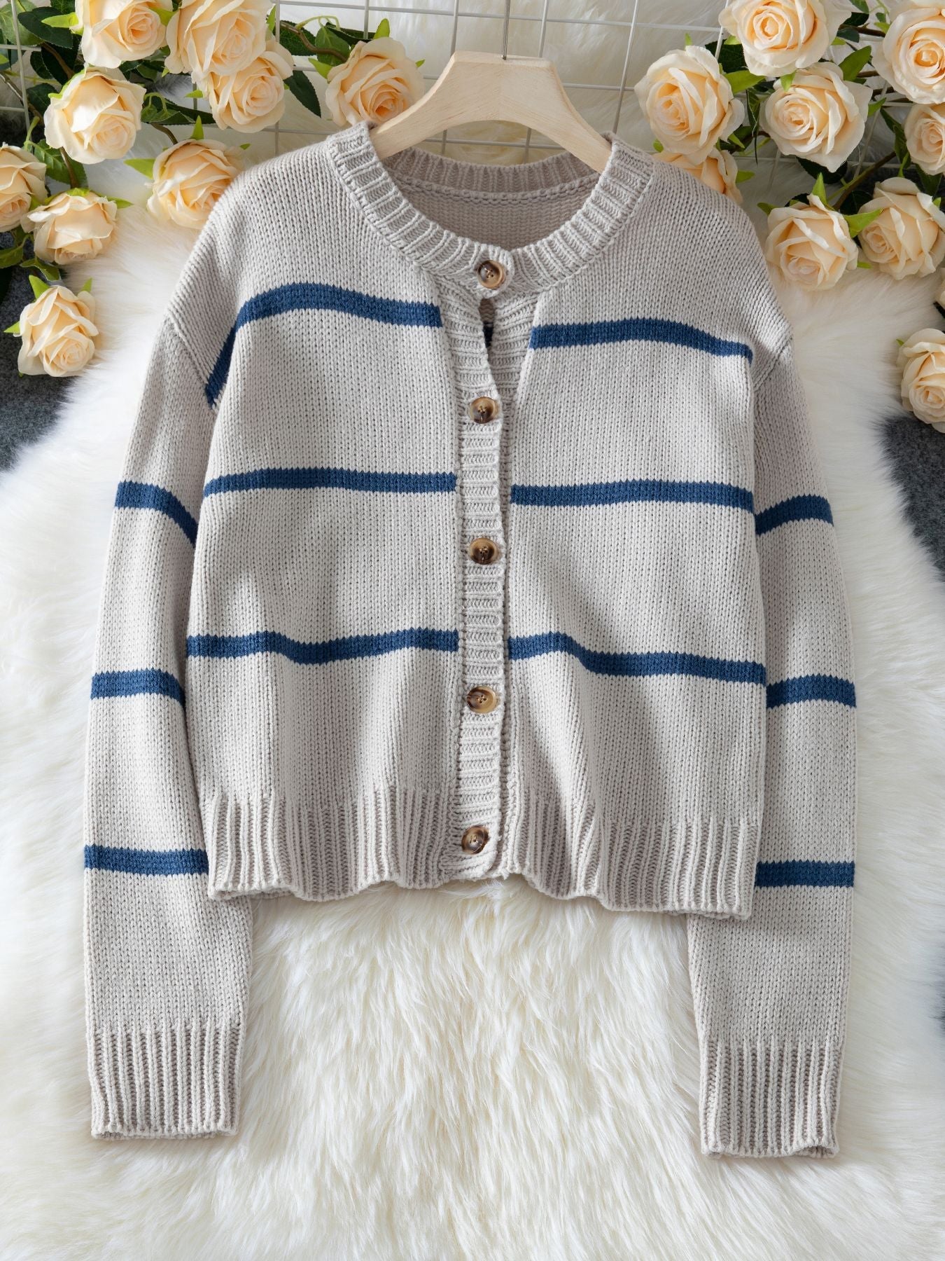 Features: Classic striped pattern, long sleeves, ribbed knit texture, drop shoulders, and chic button closure for an elegant yet casual look