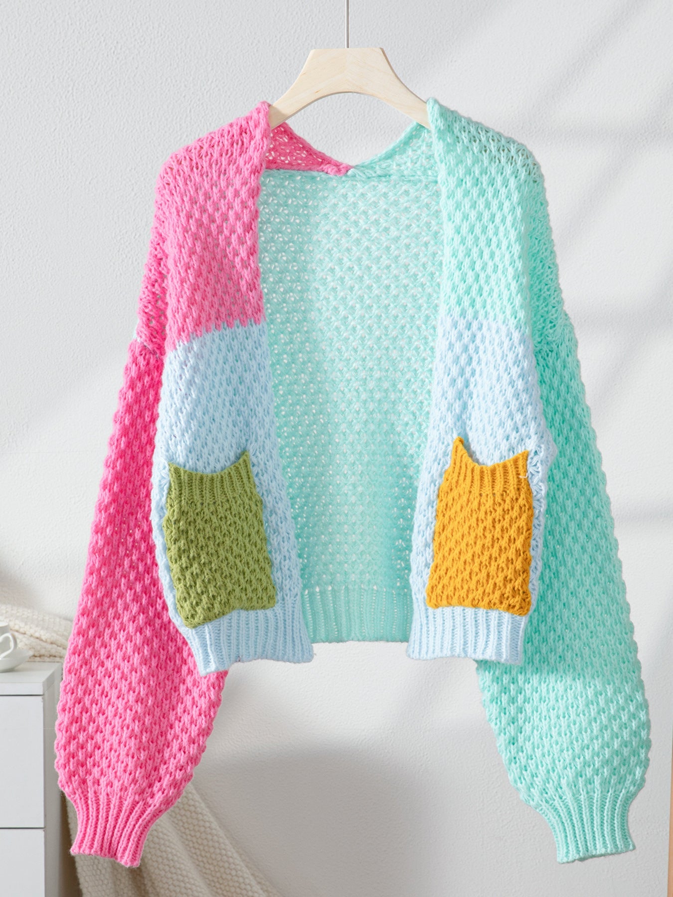 Style: Women's Color Block Boho Chunky Cardigan Cropped Lantern Sleeve Knit