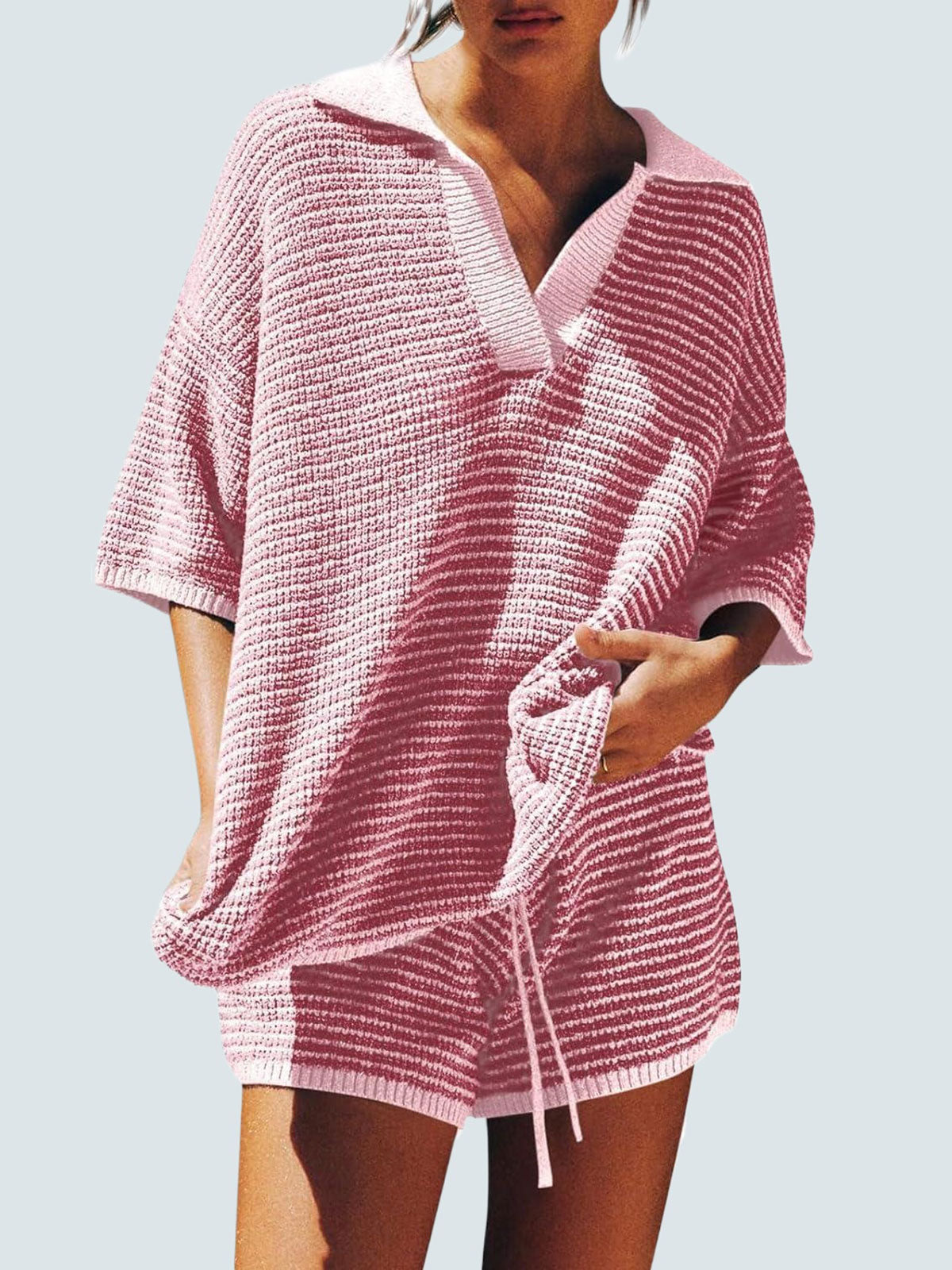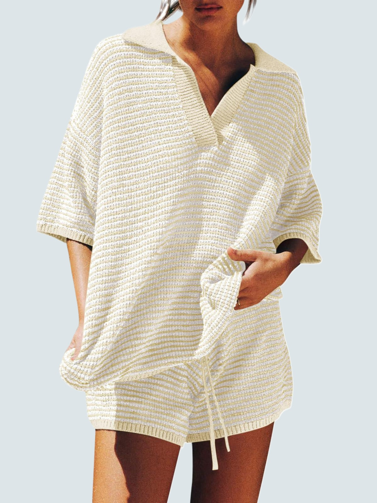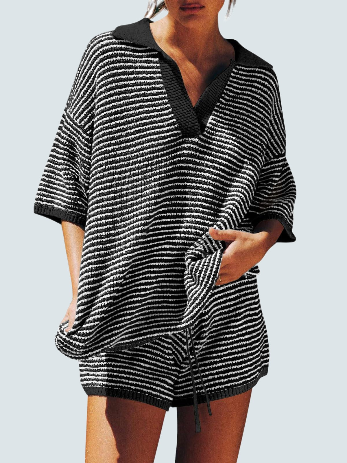 Design: Relaxed fit with 3/4 sleeves, V-neckline with collar/lapel detail, and high-waist shorts featuring a drawstring elastic waistband. Pure solid color for a chic minimal look.