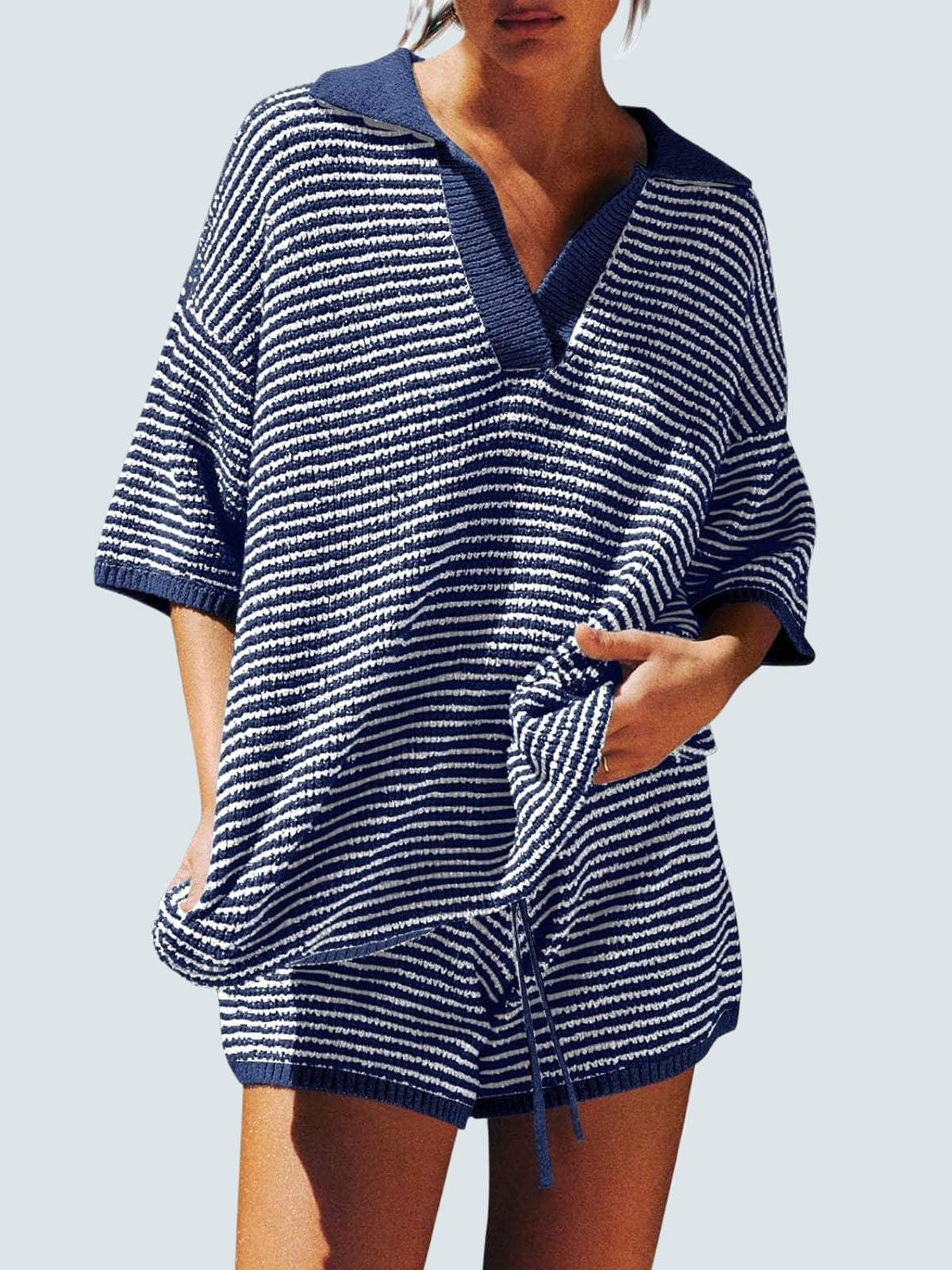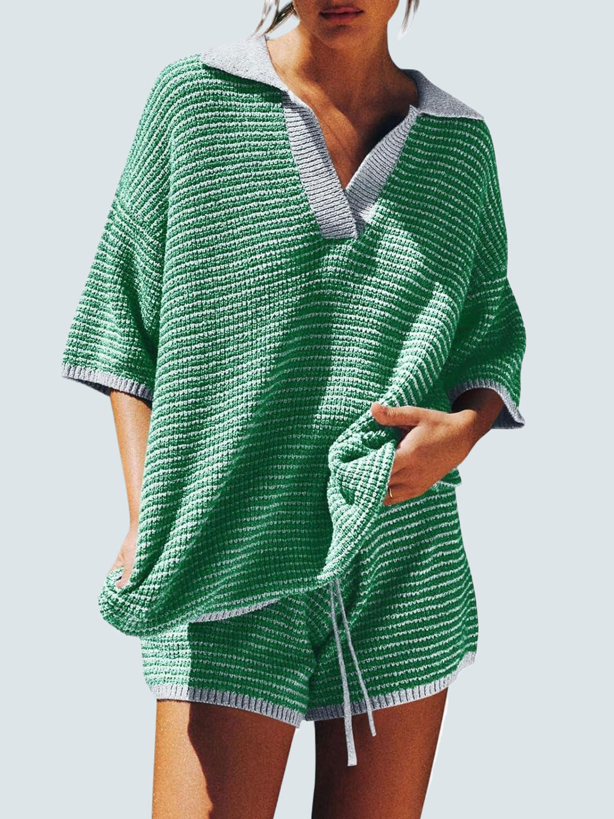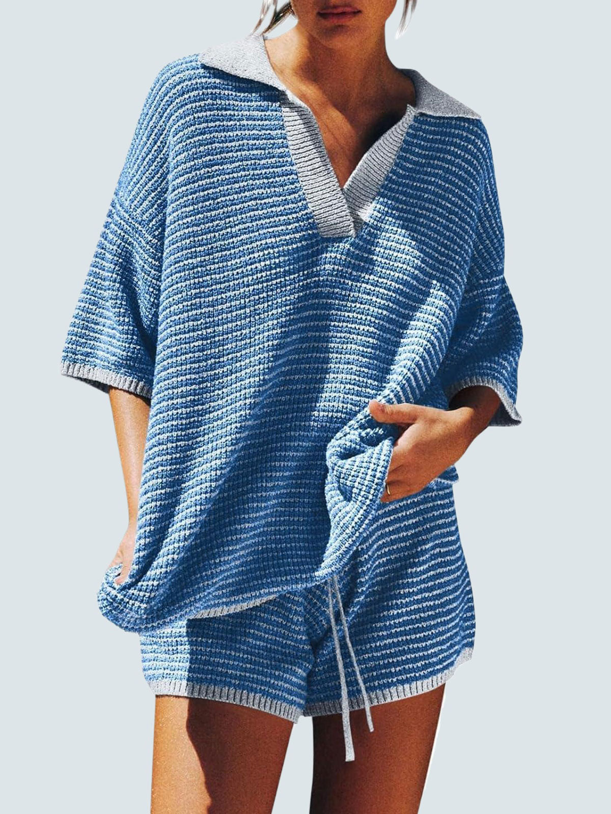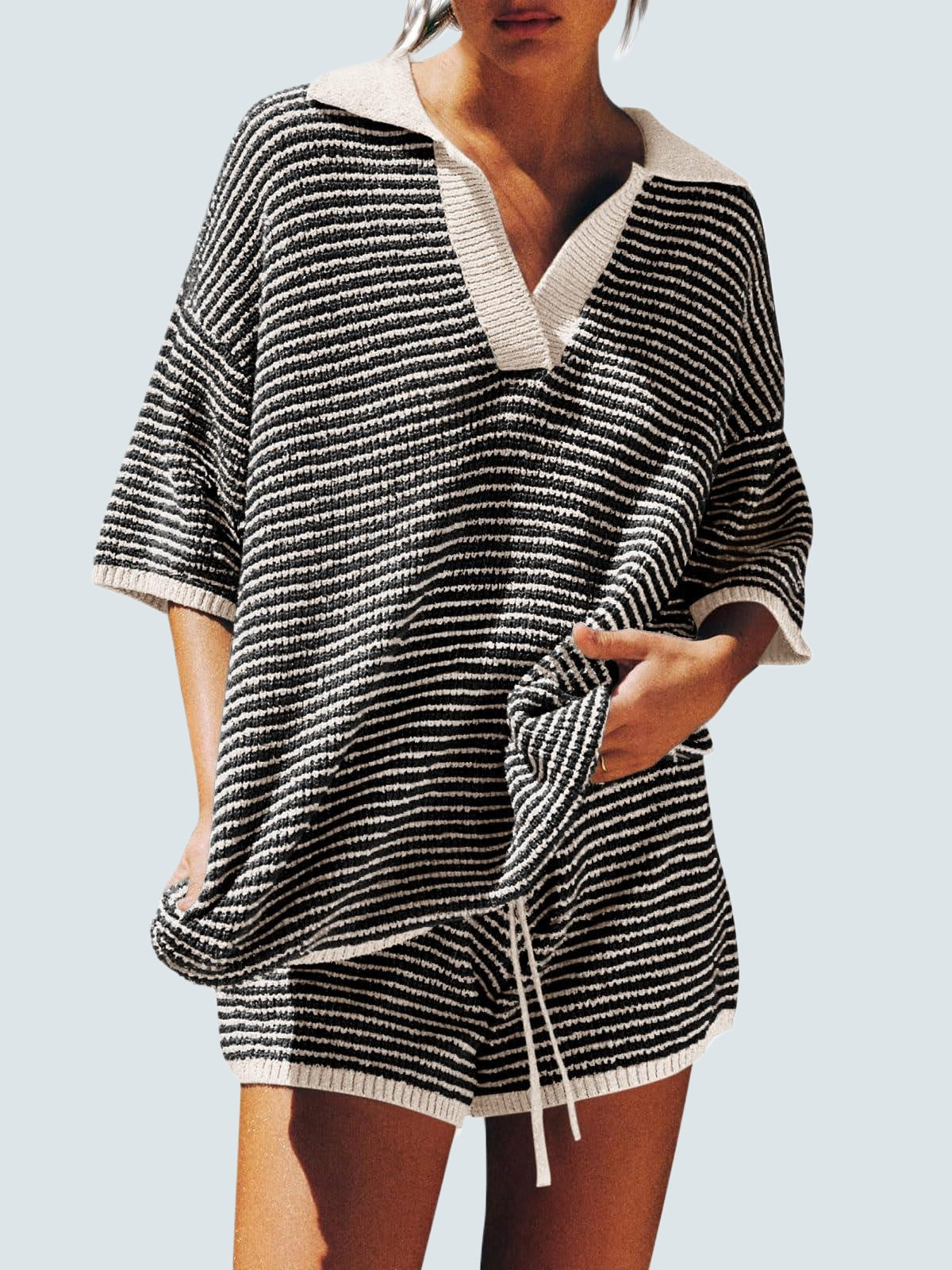 Design: Relaxed fit with 3/4 sleeves, V-neckline with collar/lapel detail, and high-waist shorts featuring a drawstring elastic waistband. Pure solid color for a chic minimal look.