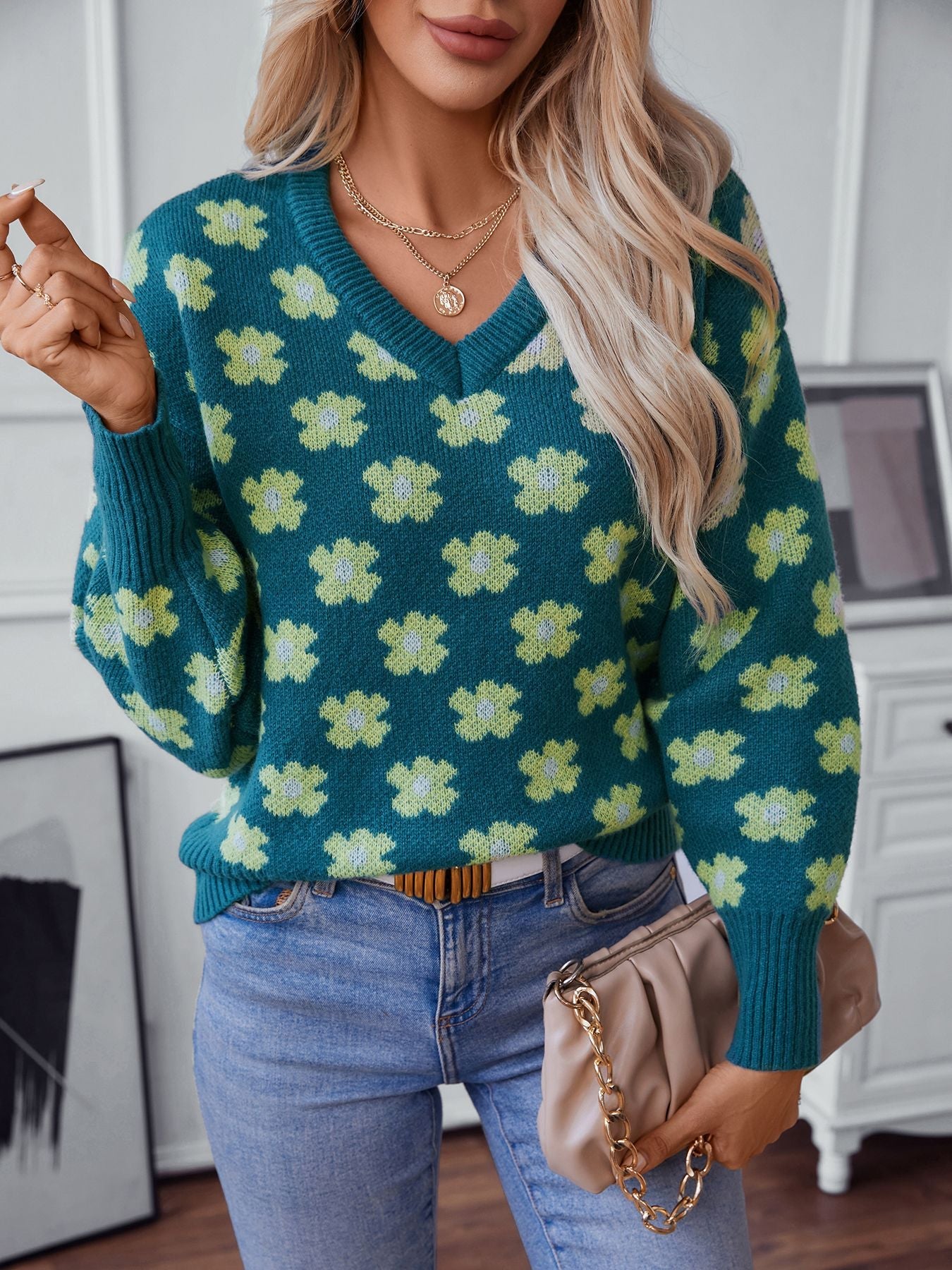 Style: Women's Floral V-Neck Pullover Sweater Loose Fit, Long Sleeve